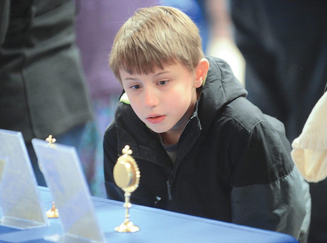 Mirror photo by Patrick Waksmunski / Evan Larkin, 10, of Patton looks at a theca relic holder during a presentation and exposition of sacred relics at the Queen of Peace Catholic Church social hall in Patton on Sunday afternoon.