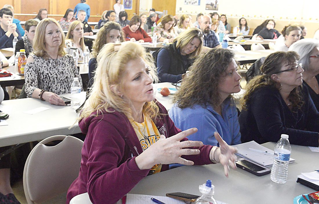 Amber Hatfield of Altoona, with PeerStar, asks a question of Heather Shnyder who was leading a discussion on “Understanding and Recognizing Sex Trafficking in Our Community” on Friday at the Hollidaysburg Church of the Brethren. Mirror photo by Gary M. Baranec
