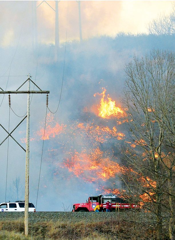 Firefighters in Logan Township and surrounding areas battled a sprawling brush fire Friday evening in the Coburn and Horseshoe Curve area, along Veterans Memorial Highway and the Norfolk Southern railroad tracks. The fire delayed trains, and firefighters called in additional manpower as they worked to contain the blaze. Elsewhere Friday, fire destroyed a Frankstown Township barn and several municipalities have imposed burning bans. Mirror photo by Patrick Waksmunski