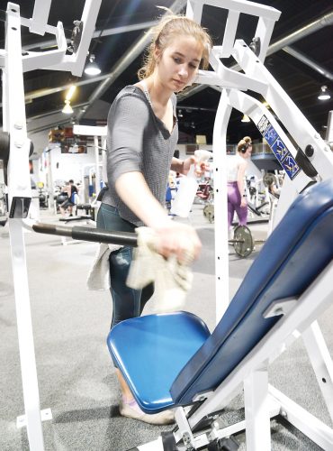 - Mirror photo by Patrick Waksmunski / Gorilla House Gym employee Rachel Ross of Hollidaysburg disinfects exercise equipment after use at the Altoona gym on Monday afternoon.