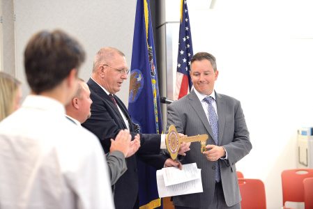 Mirror photo by Patrick Waksmunski Michael Kelly of KCBA Architects (right) presents the key to the building to Altoona Area School District Superintendent Charles Prijatelj.