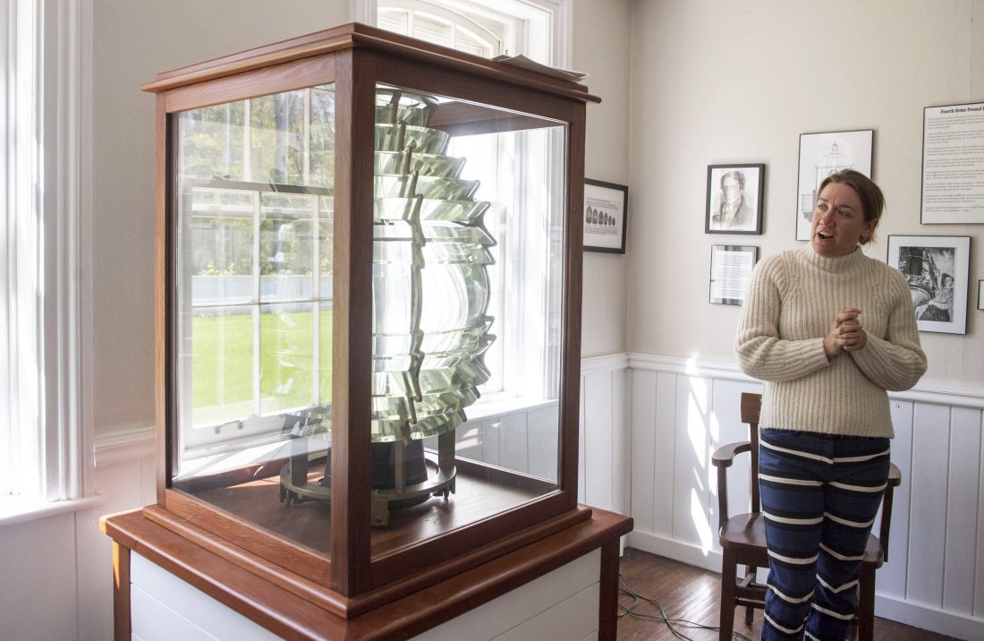 - Emily Butler, executive director of the Presque Isle Lightstation, talks about an original fourth order Fresnel lens from another lighthouse on loan from the Erie County Historical Society. Pittsburgh Post-Gazette photo by Emily Matthews via AP