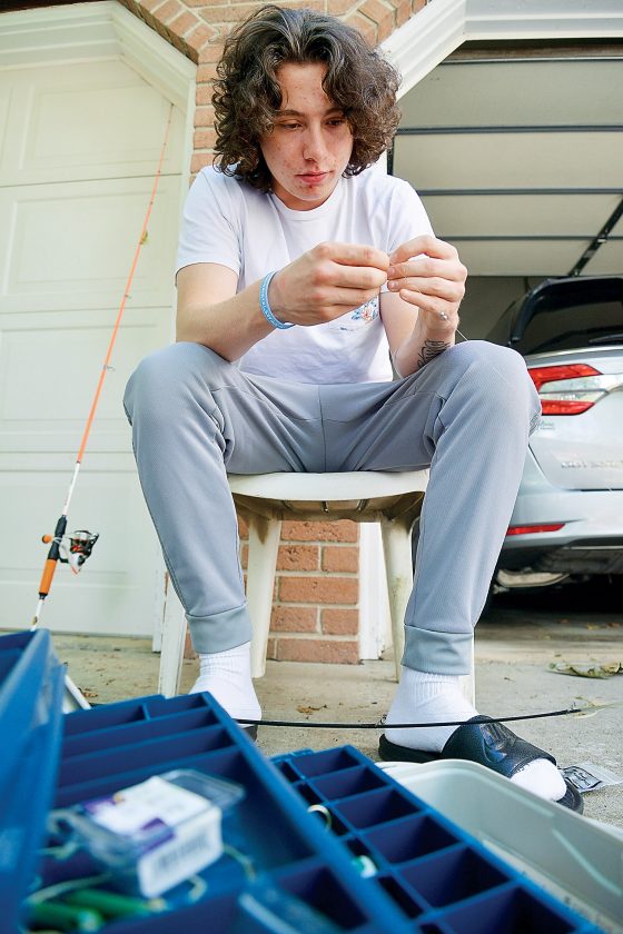 Shane Watchey, 22, of Hollidaysburg, ties on a fishing lure before departing his Beech Street home for Brush Run on Monday afternoon.