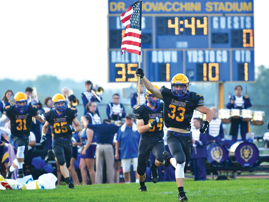 Senior Isac Harbaugh leads his team onto the field at Dr. Giovacchini Stadium as Chestnut Ridge hosted Central High School on opening night in Fishertown.