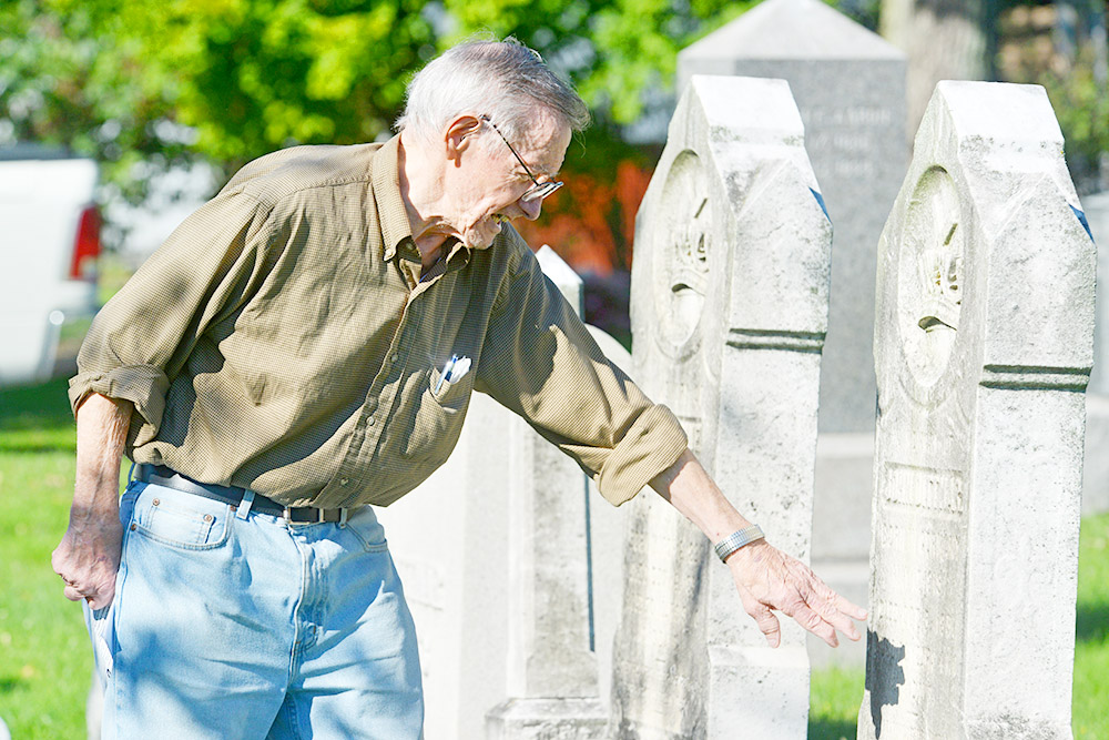 Mirror photo by Patrick Waksmunski / Photo Illustration by Nick Anna David Snyder points out the marker for John Dittmar, one of the charter members who founded St. John’s Reformed Church in Loysburg. Mirror photo by Patrick Waksmunski