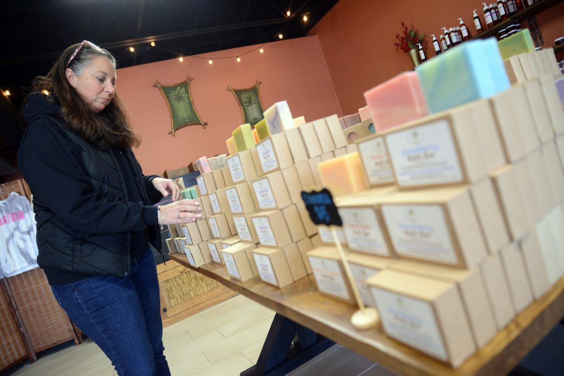01/27/22 Mirror photo by Patrick Waksmunski / Trade Secrets owner Stephanie Hite arranges the ample varieties of handmade bath bars offered at the store.