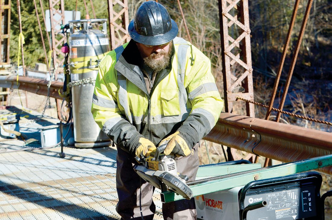 Ross Brown, co-owner of Wrought Iron Bridge Works of New Jersey, disassembles part of the Red Mill Bridge in Blacklick Township, Cambria County. Demolition of the bridge — built in 1895, but closed to traffic for over a decade — began Tuesday. Mirror photo by Calem Illig