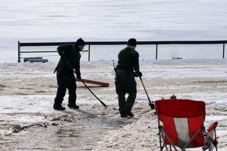 Department of Conservation and Natural Resources officials worked to clear surfaces of ice.