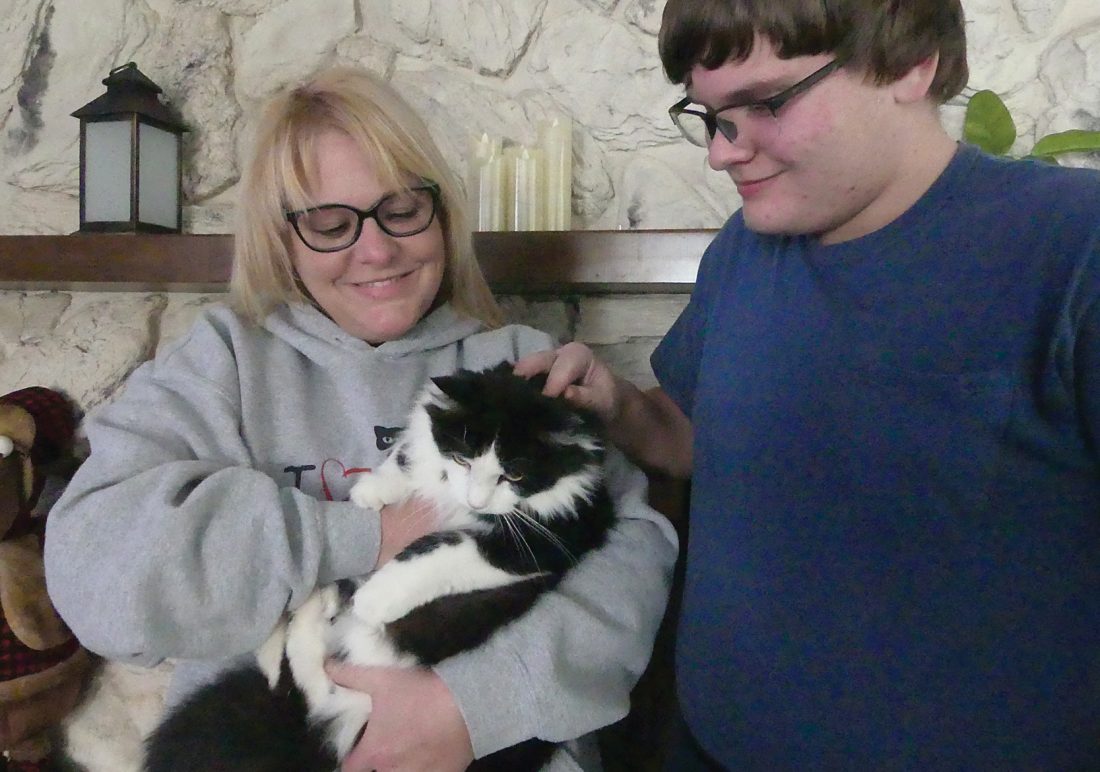 BJ Ross (left) and her son Gavin, give the family’s resident cat burglar, Jordan, some love. Mirror photo by Rachel Foor