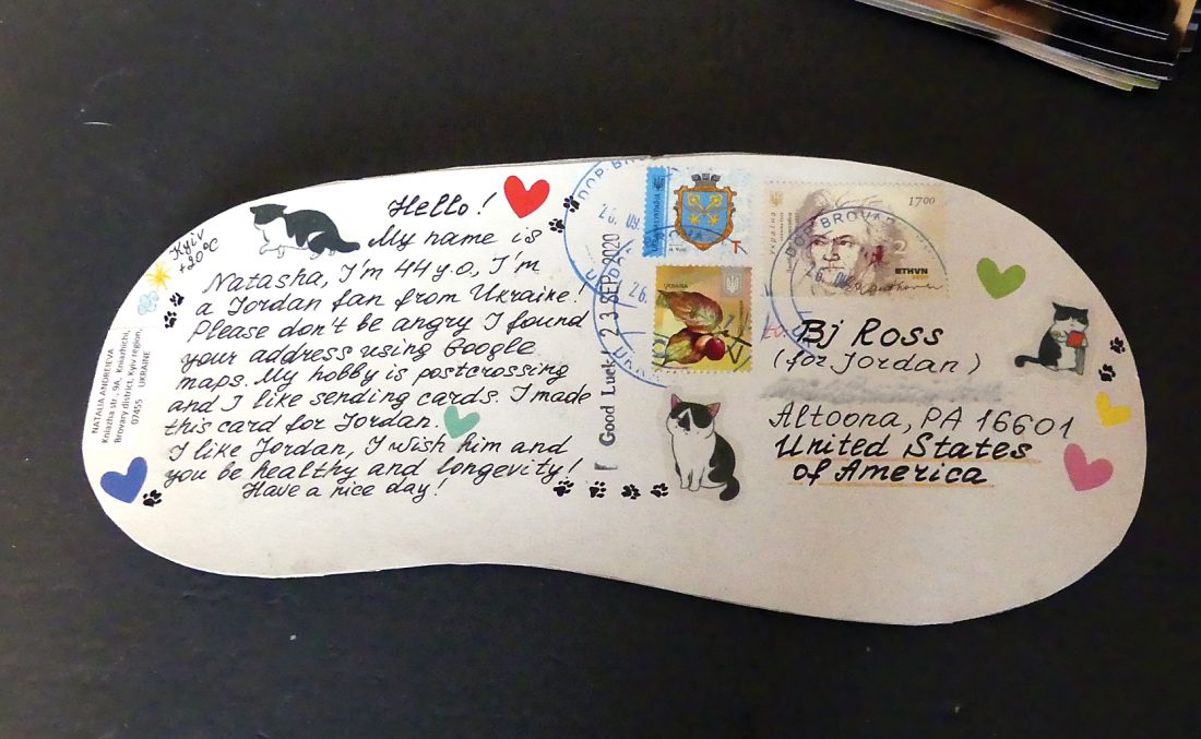 Jordan also receives letters and drawings from young children that Ross is always sure to answer. One of the coolest, more detailed cards Jordan received was from a Korean fan, who sent a handmade postcard that looked like a shoe, Ross said.