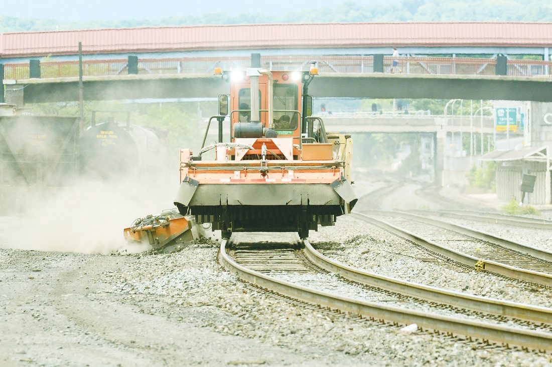 A Norfolk Southern Maitenence of Way ballast regulator kicks up dust along the mainline near Altoona Pipe and Steel as it grooms ballast on Monday morning.