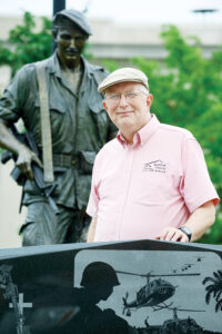 Bedford County Conference & Visitors Bureau director Dennis Tice stand in front of the statue of Vietnam War Medal of Honor recipient Bob Hartsock in Veterans Grove in Bedford. Mirror photo by Patrick Waksmunski