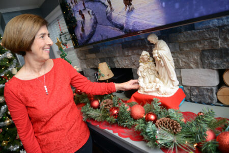 Mirror photo by Patrick Waksmunski Diane Stephens adjusts a nativity set on the fireplace mantel shelf in her Hollidaysburg home.