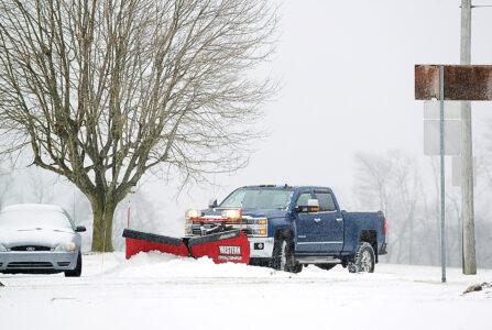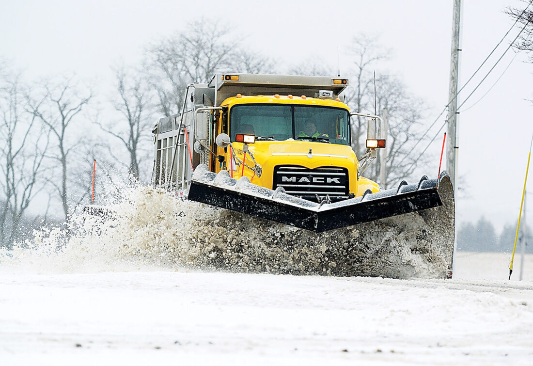 - A PennDOT plow truck pushes snow and slush from Route 36 north of Ashville on Thursday afternoon. Mirror photo by Patrick Waksmunski