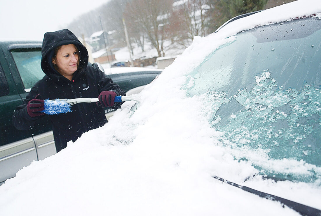 Brandi Fitzpatrick clears the windshield of her vehicle as she gets ready to depart her Patton home for work across town on Thursday morning. Mirror photo by Patrick Waksmunski