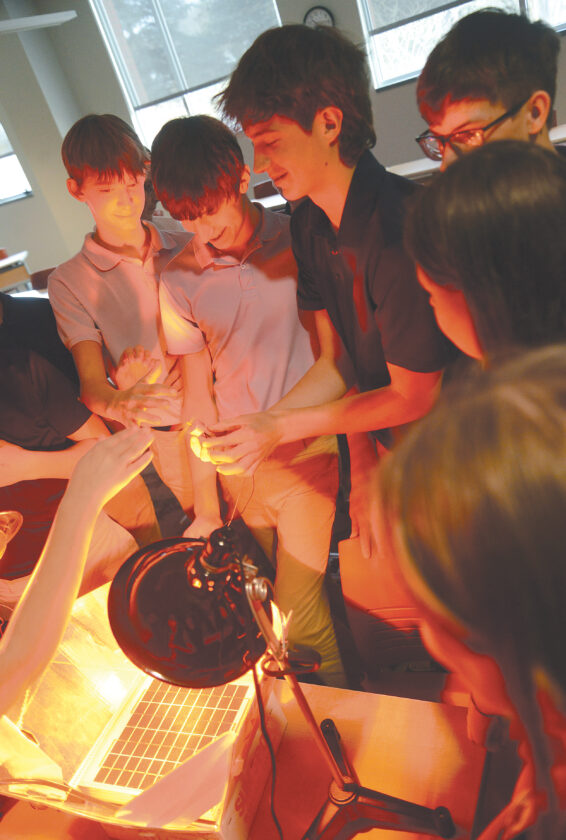 Mirror photo by Patrick Waksmunski Eighth grade students Blake Seymour, Vincent Seymour and Matthew Zernick (from left) from St. Michael School in Loretto experiment with electricity from solar panels during the soft open of the Earth to Moon interactive exhibit at the Saint Francis University Science Outreach Center on Wednesday morning.