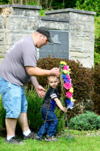 Mirror photo by Patrick Waksmunski Jared Daughenbaugh gets help from his son, Brodie, 3, laying the wreath at the 130 year anniversary of the Walter L. Main circus train wreck in Vail on Wednesday morning.