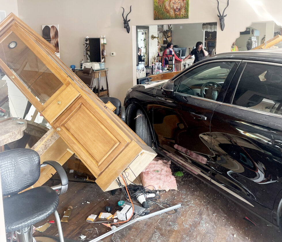 Courtesy photo A vehicle remains inside Tame Your Mane salon after crashing through the front window on Monday morning in East Freedom. No serious injuries were reported.