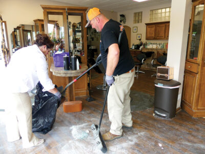 Mirror photo by Cati Keith Dave Alexander and Christie Yingling of Servpro Ebensburg help to clean up debris after a car crashed through the front of the building at Tame Your Mane salon at 114 Back St. in East Freedom.