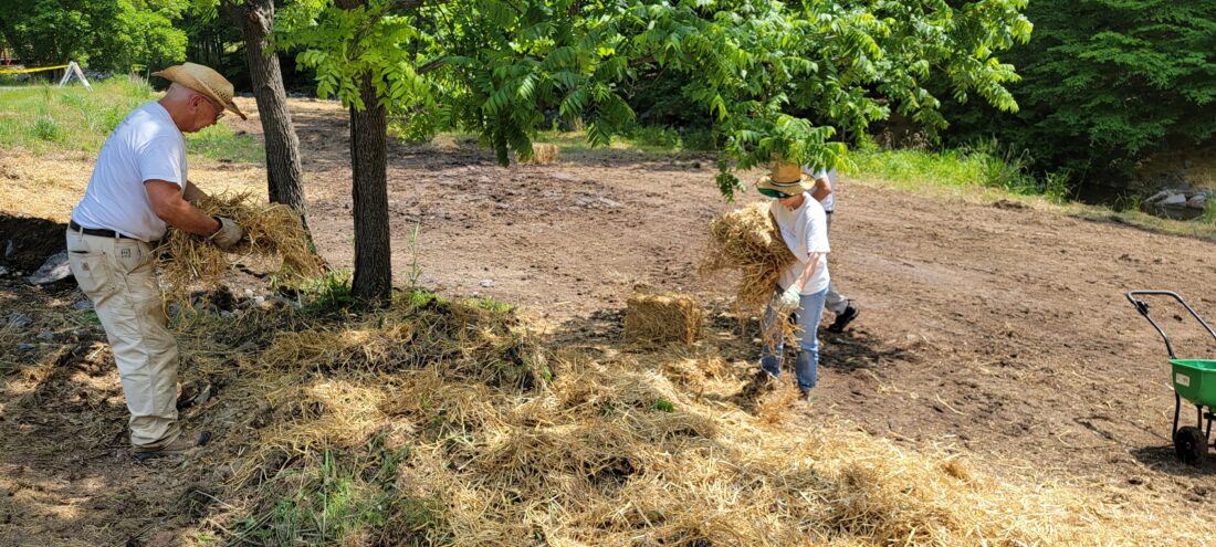 Mirror photo by Cati Keith / Bedford Joint Municipal Authority volunteers Jim Wehling and Karen Simpson put down straw along the bank of Shober’s Run as part of a stream bank enhancement project which is near the Omni Bedford Springs trailhead of the Shuster Way Heritage Trail in Bedford.