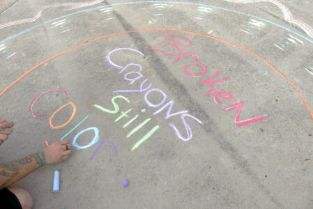 - Mirror photo by Linden Markley A participants draws a colorful message reading “Broken crayons still color” onto the pavement at Heritage Plaza on Wednesday evening as part of the Empowering Arts for Men in Recovery program at ArtsAltoona.