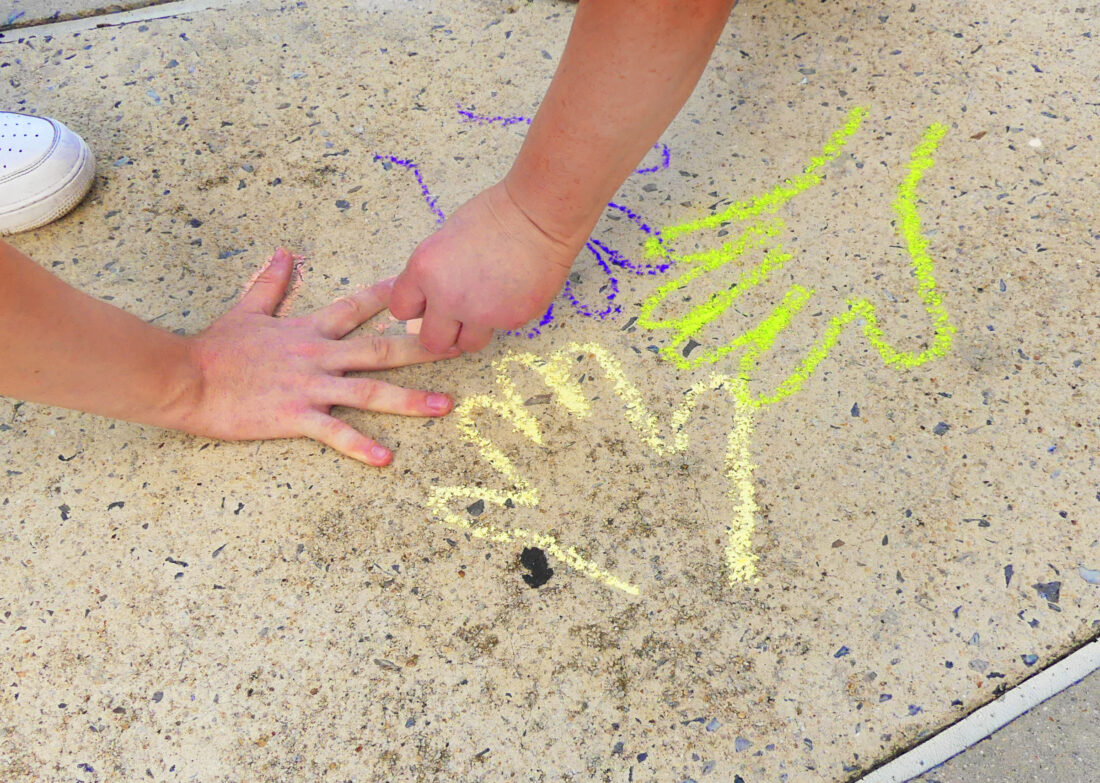 Using the chalk, one participant traced the hands of the others, creating colorful outlines of outstretched fingers.