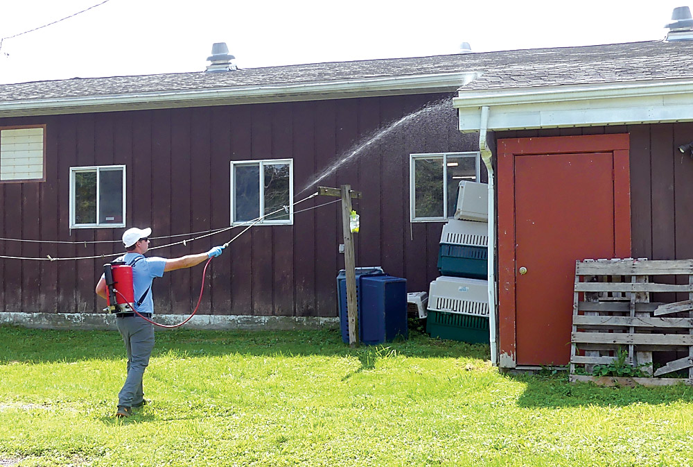 Exterminator Greg Ferguson of Ferguson Pest Control of Altoona sprays for yellow jacket bees on the roof of the Central Pennsylvania Humane Society. Mirror photo by Cati Keith