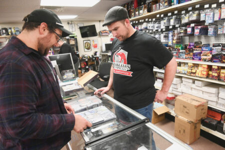 Co-owner Tom Foley (right) shows Erich Hurliman of Altoona a binder of Magic the Gathering single cards for sale at Snake Eyes Gaming. The store also buys collectible gaming cards. Mirror photo by Patrick Waksmunski