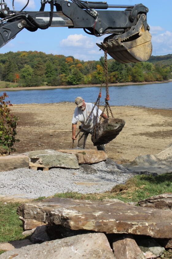 Mirror photo by Holly Claycomb Stan Corley pulls and pushes a large rock into position as he and Wayne Hyde, operating the backhoe, work to build a new kayak launch at Shawnee State Park on Tuesday. The lake level at the Schellsburg park in Bedford County was lowered to allow for maintenance work at the main boat launch, boat house and handicap accessible fishing pier, they said. Most of the work is done and the lake is now refilling.