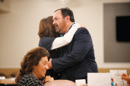 - Dave Consiglio (right) hugs his sister Kellie Hurd of Hollidaysburg next to their cousin Jackie Runk of Altoona during an election gathering at the Heidelberg Country Club on Tuesday evening. Mirror photos by Patrick Waksmunski