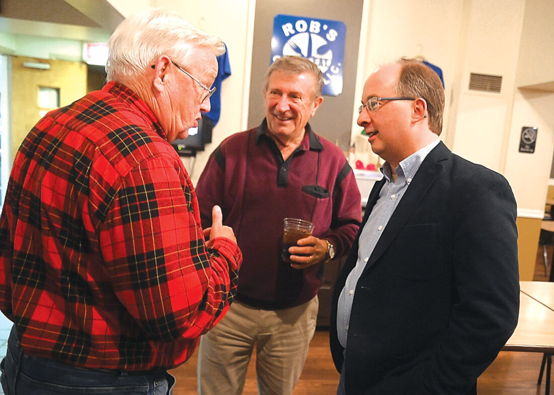 Judge Wade Kagarise (right) talks with supporters Harry Mullins (left) of Williamsburg and Martinsburg Mayor Rich Brantner during an election night gathering at the Heidelberg Country Club on Tuesday evening. Mirror photo by Patrick Waksmunski