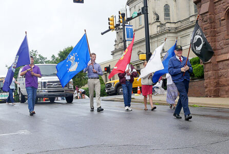 - Pastor Gary Dull (right) of Faith Baptist Church in Altoona carries the POW-MIA flag followed by flag bearers carrying the flags from the branches of the United States Armed Forces as they march along 12th Avenue in Altoona during the annual Memorial Day parade. Mirror photo by Conner Goetz