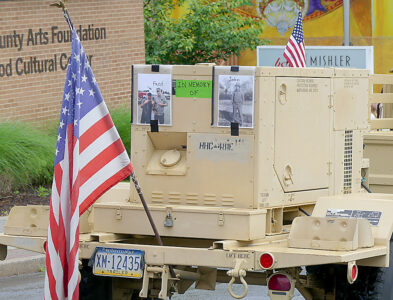 A military vehicle taking part in the Memorial Day parade pays special tribute to two veterans as it moves along 12th Avenue in Altoona on Monday. Mirror photo by Conner Goetz