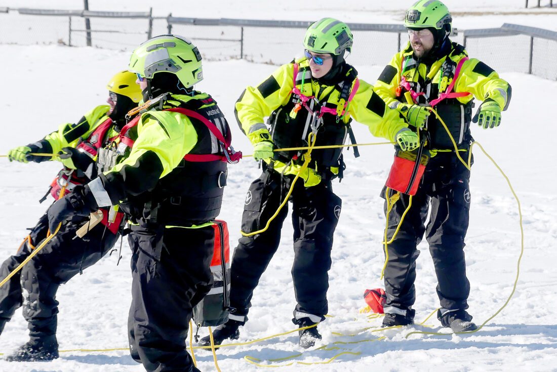 During the team’s training, each member took turns practicing pulling themselves out of a hole cut into the 10-inch-thick ice to safety. Once in the water, Grahn asked each person if they were okay several times before instructing them to “get out of bed” — hook a foot on the ice behind them and roll flat onto the surface.
