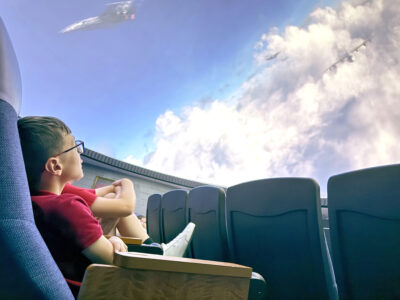 The students then entered the planetarium’s auditorium, where they looked up to the ceiling to view a new 12-minute special, “Always Above,” from the United States Space Force.