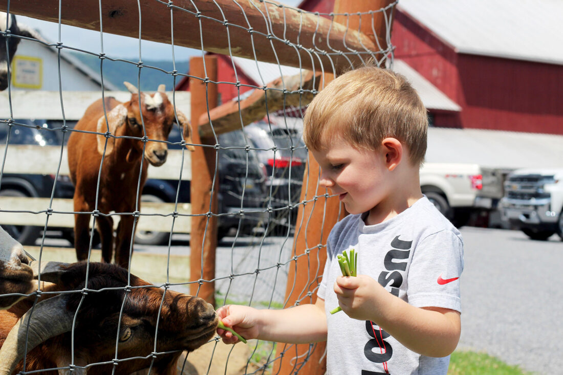 - Sawyer Jones feeds many hungry goats a lunchtime snack outside Hilltop Produce in Sinking Valley. Mirror photo by Colette Costlow