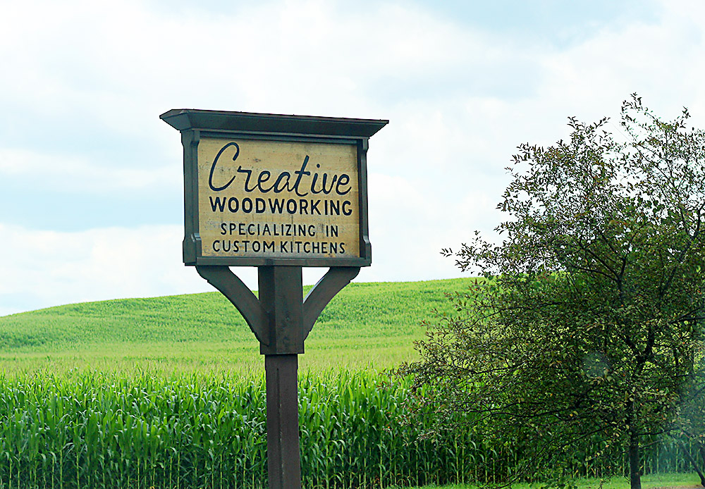 A sign advertising 'Creative Woodworking' stands outside Jacob Peachey's business in Sinking Valley. Mirror photo by Colette Costlow
