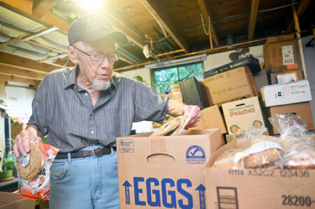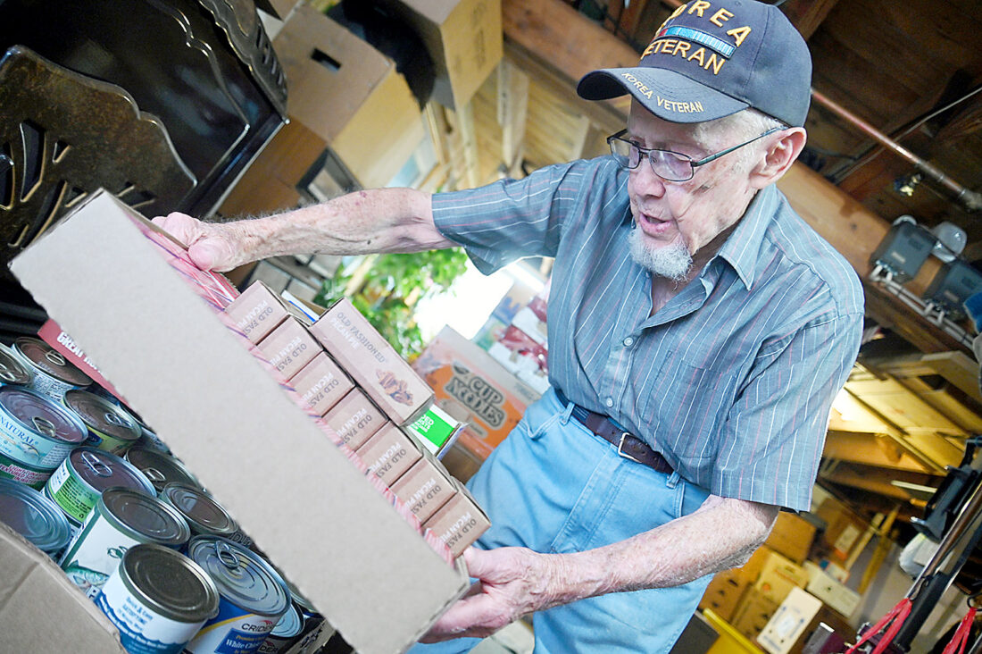 William Grove of Portage goes through the groceries that he’s collected and stored in his basement. Grove collects food from local stores and restaurants and donations to help the Portage elderly and veteran communities. Mirror photo by Patrick Waksmunski