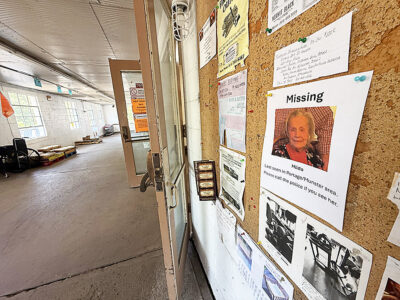 - Missing person flyers like this one seen at Stager’s store were displayed across the area in hopes of locating Hilda Sossong of Munster Township. Mirror photo by Matt Churella