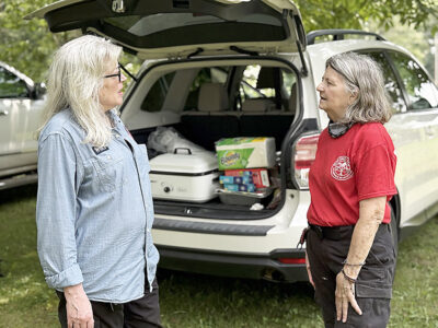 Nina Wolf of the Mountaineer Area Rescue Group’s north division rescue squad speaks with Carol Thompson of the Bedford County Wilderness Search Team during the search Wednesday for Hilda Sossong. Mirror photo by Matt Churella