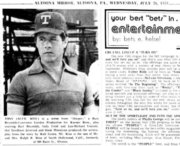 - This photograph of Alfie Wise, playing Tony in “Hooper,” was published in the July 26, 1978, Altoona Mirror. The photo caption points out that Wise is the son of Mr. and Mrs. Ralph R. Wise of North Hollywood, California, formerly of Race Street, Altoona. Courtesy photo