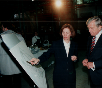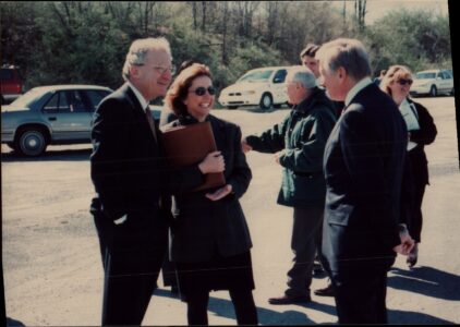 - Bette Slayton, recently retired president/ CEO of Bedford County Development Association, shows U.S. Rep. Bud Shuster plans for Bedford’s first business park, which opened in 1999. Courtesy photo