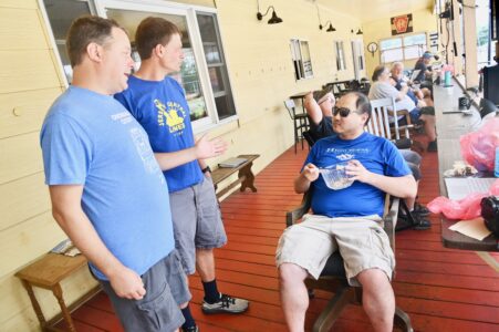 Mirror photo by Patrick Waksmunski / Dave Abeles of Lebanon, N.J., and his brother, Ben Abeles of Winterstown, Pa., (from left) talk trains with Josh Hollands of Bistow, Va., on The Station Inn front porch.