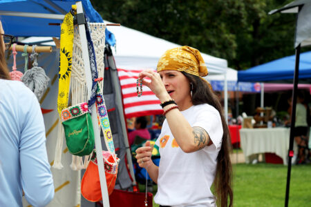 Aarika Price of Vibes and Vines shows customers a handmade bracelet at the Bedford farmers market. Mirror photo by Colette Costlow