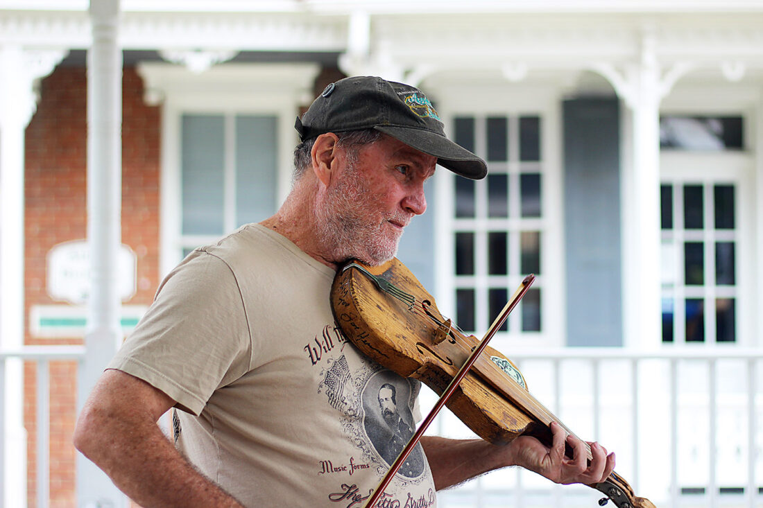 Local artist and musician Kevin Kutz played the mandolin while Jeff Ziegler played the fiddle Wednesday in the gazebo on the Public Squares in Bedford, the site of the weekly farmers market.