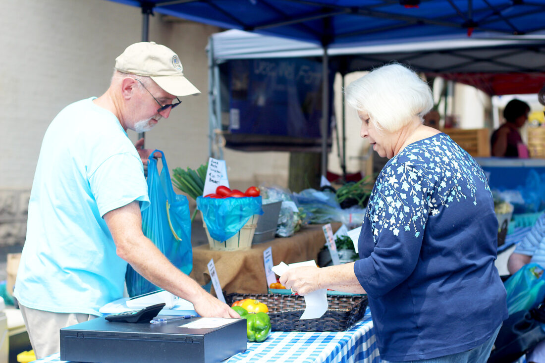 A customer makes a purchase at the Blue Barn Farm stand at the Hollidaysburg farmers market. Mirror photo by Colette Costlow