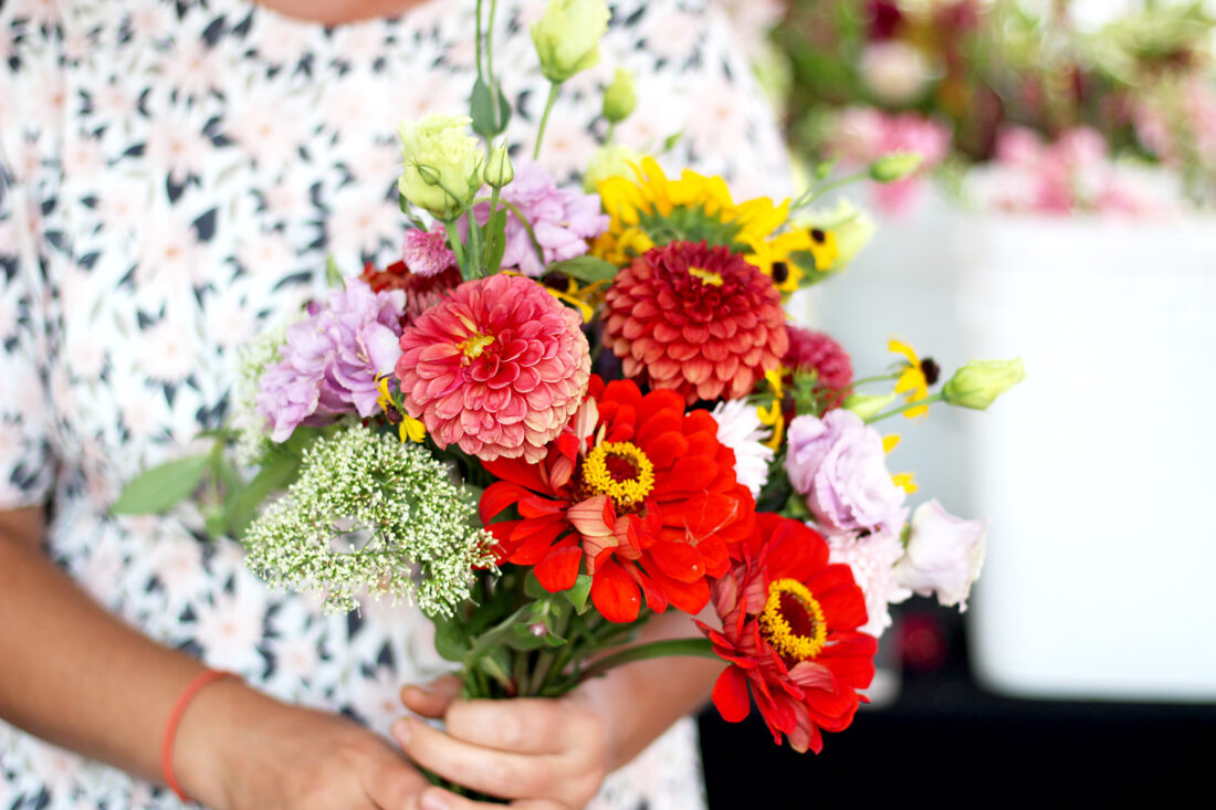 At a nearby booth, the Posie Patch, Mary Lou Zimmerman and Sheryl Martin pick and arrange flowers for customers, creating colorful bouquets from a wide variety of blooms.