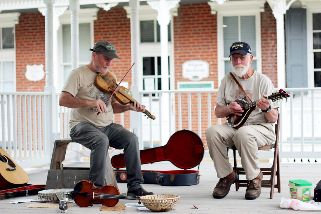 - Local artist and musician Kevin Kutz (left) plays the mandolin while Jeff Ziegler plays the fiddle Wednesday in the gazebo on the Public Squares at the Bedford farmers market. Mirror photo by Colette Costlow