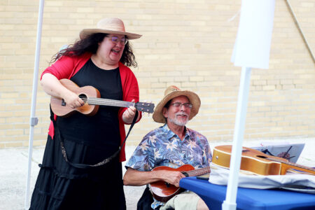 Ukulele players Ramsey and Pat Baeckle provided music Tuesday at the Hollidaysburg market, where Ramsey said music gives a farmers market a “block party aspect.”