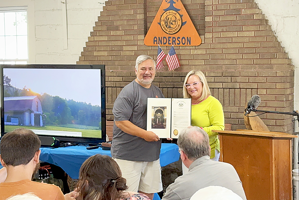 The also gathered in the camp’s dining hall to watch state Sen. Judy Ward present a Senate citation to Camp Anderson Corp. President Brian Bressler and Vice President Cummins McNitt, who noted the beautiful weather to celebrate “this amazing heritage” on Saturday.